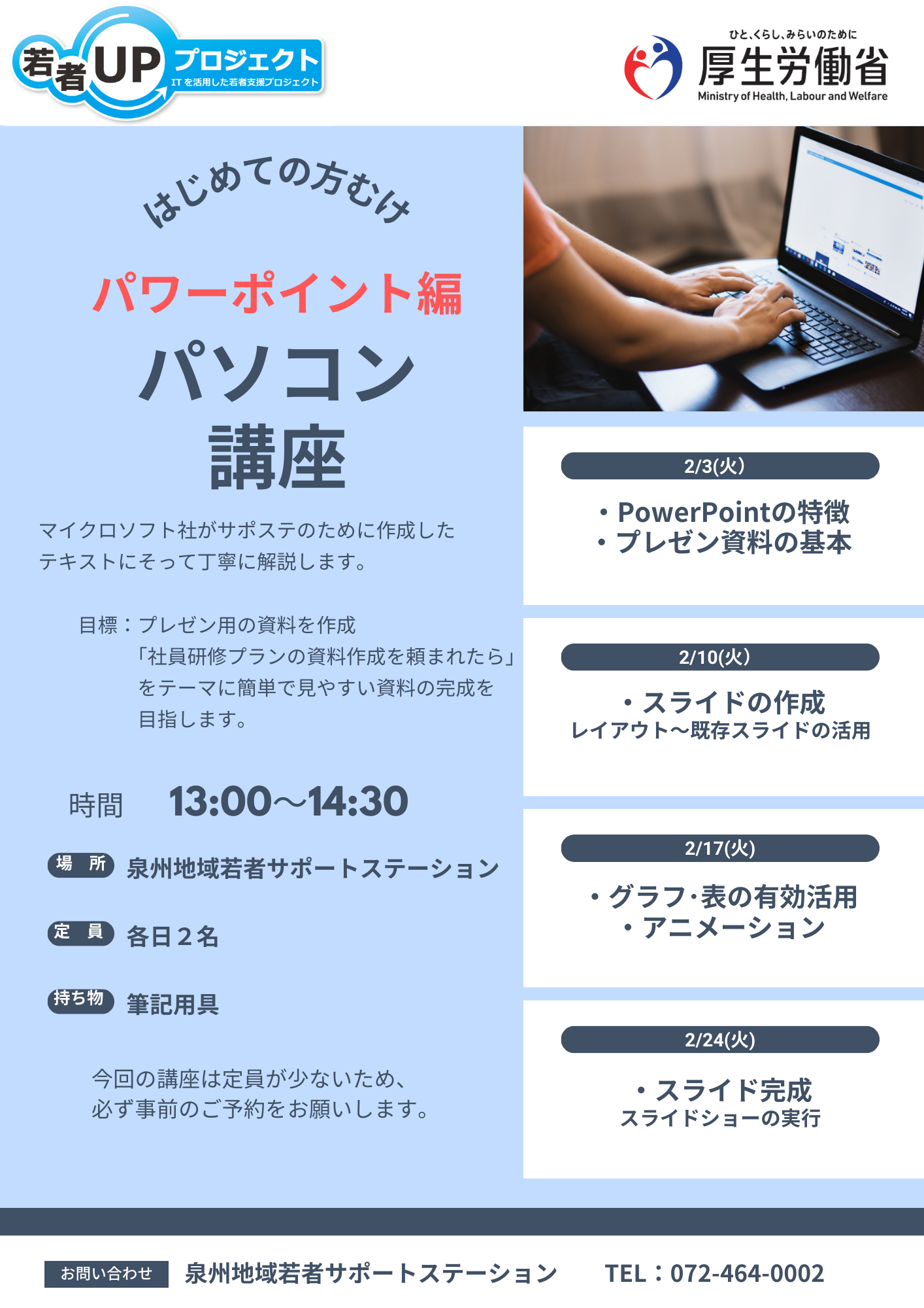 パソコン講習は事前予約制となります。ご予約は泉州サポステまでお願いします。