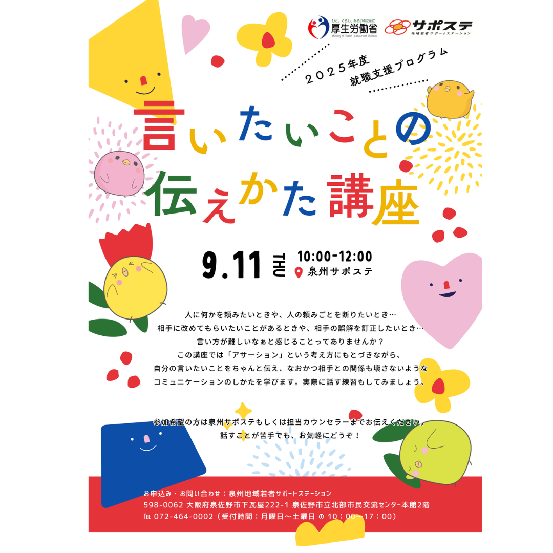 9月11日(木)に、就職支援プログラム「言いたいことの伝えかた講座」を開催します。ご予約おまちしています。